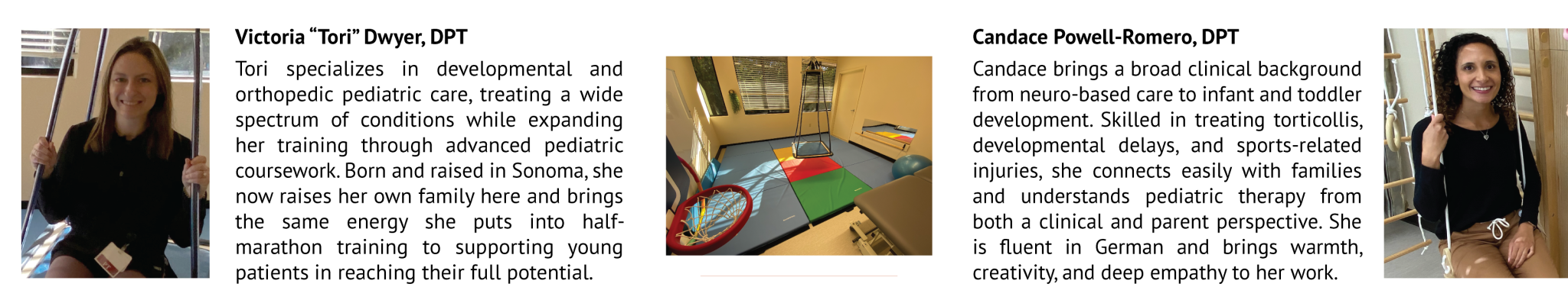 Candace aporta una amplia experiencia clínica de la atención basada en la neurología al desarrollo de bebés y niños pequeños. Altamente capacitada para tratar el tortícolis, las demoras de desarrollo y las lesiones deportivas, se conecta fácilmente con las familias y comprende la terapia pediátrica desde una perspectiva clínica y de madre. Habla el alemán con fluidez, y aporta calidez, creatividad y una profunda empatía a su trabajo.